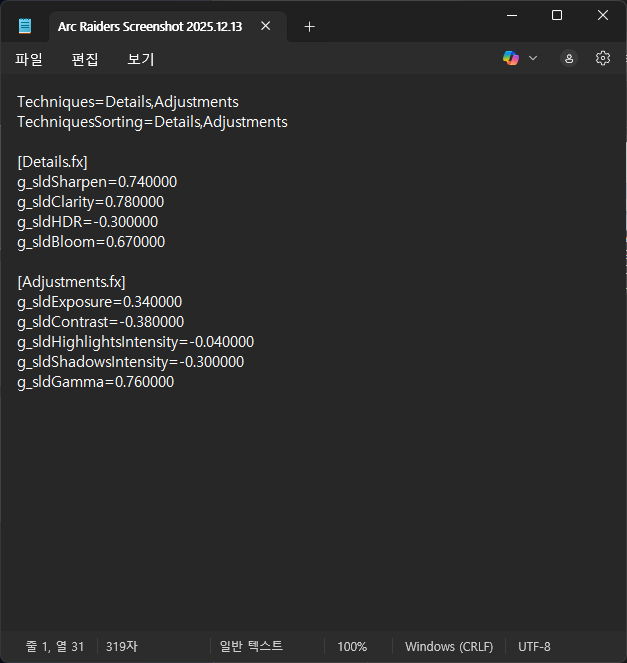 해당 설정들은 아크레이더스에서 Nvidia 게임필터 설정 내용이며 본인이 사용하는 설정 수치 넣고 저장하셔도 됩니다.