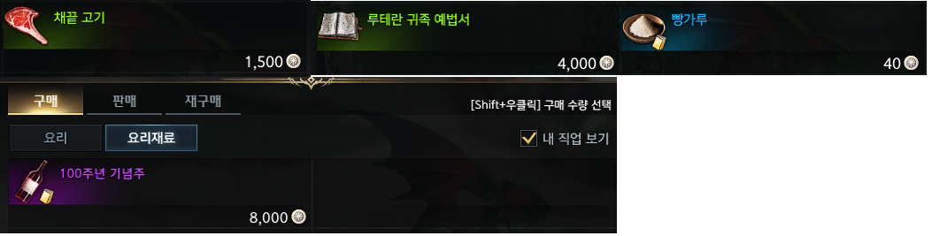 3. 루테란 예식 요리 - 루테란 성의 요리 상인들 '채끝 고기', '루테란 귀족 예법서' 구매. 요리사 npc에게 제작.