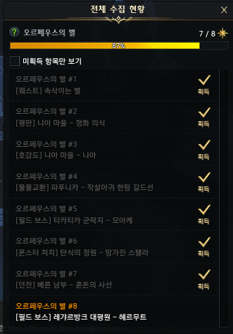 | 오르페우스의 별 #6 | [몬스터 처치] 망가진 스텔라 → [던전] 비탄의 섬 - 탄식의 정원 (반복퀘스트로 열쇠 획득) |