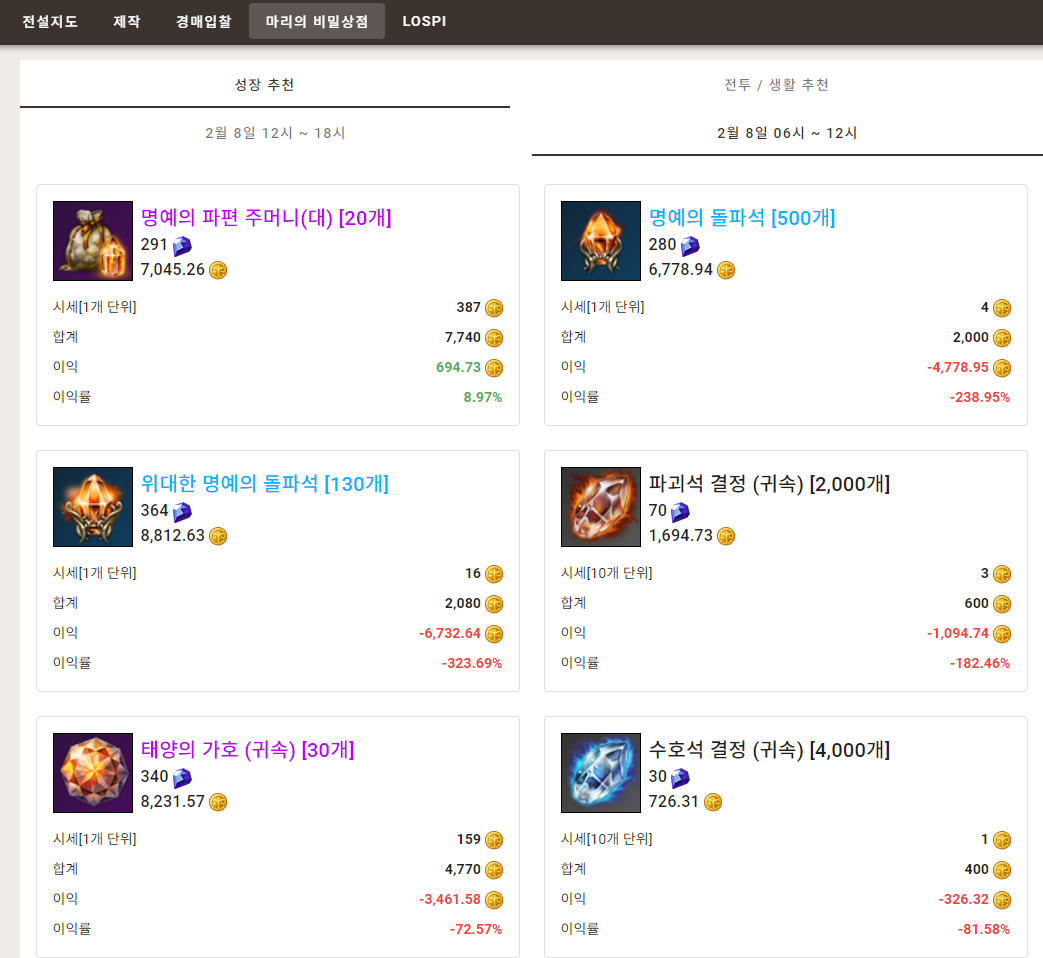 4. LoaTool ( 로아툴 ) - 전설지도, 크리스탈 시세, 마리상점 효율, 영지 제작 효율 계산