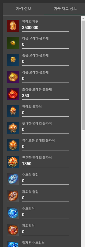 귀속 재료 입력시 0골드로 계산 채크 해주시면 됩니다.
