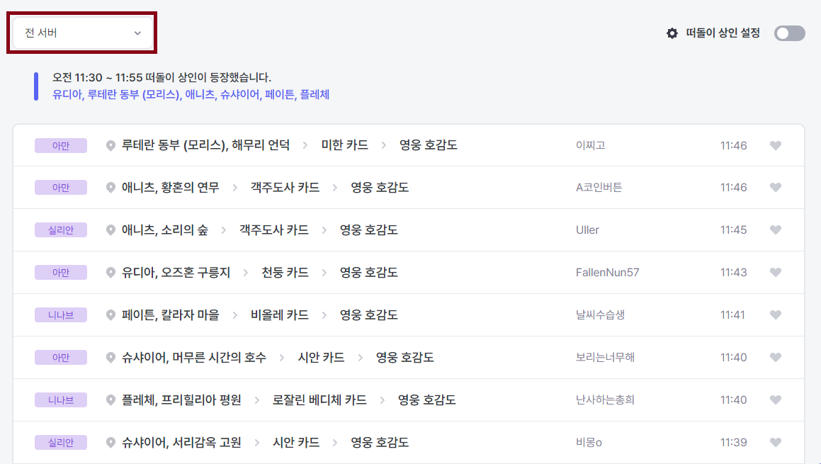 알람을 등록하여 등록시 알람 받는 방법으로 떠돌이 상인 확인하시면 됩니다.