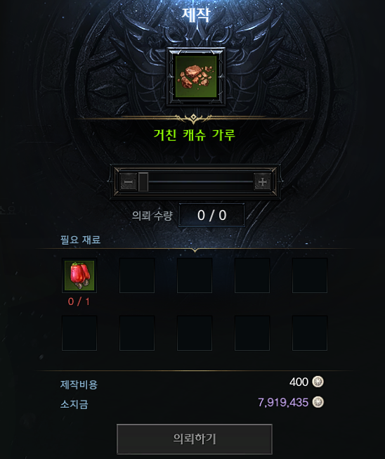 캐슈캐슈 스무디 - '커친 캐슈 가루' 제작시 확률적으로 만들어지는 '고운 캐슈 가루' 2개를 획득하여 제작.
