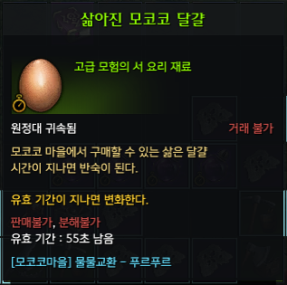 좋아좋아 달걀 반숙 - NPC'푸르푸르'가 판매하는 삶아진 모코코 달걀 구매 후 1분후에 '좋아좋아 달걀 반숙'으로 변화 됨.