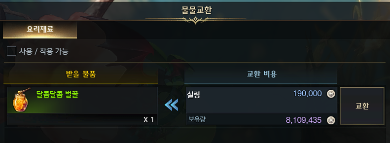 달콤달콤 로열젤리 - 바다향기 숲 맵 해당위치에서 벌집을 획득하여 요리사 NPC 에게 제작.