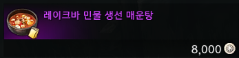 2. 레이크바 민물 생선 매운탕 - 레이크바 마을 '이비엔' 이 판매하는 '레이크바 민물 생선 매운탕' 아이템을 구입하여 사용.