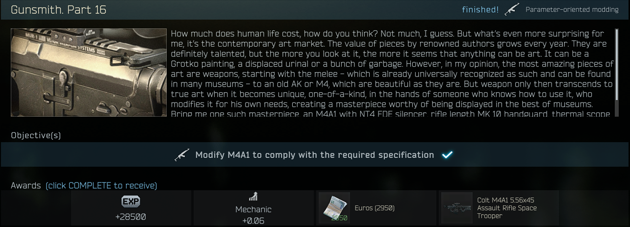 타르코프 0.12.9 버전 메카닉 건스미스 퀘스트 파트 16 정보