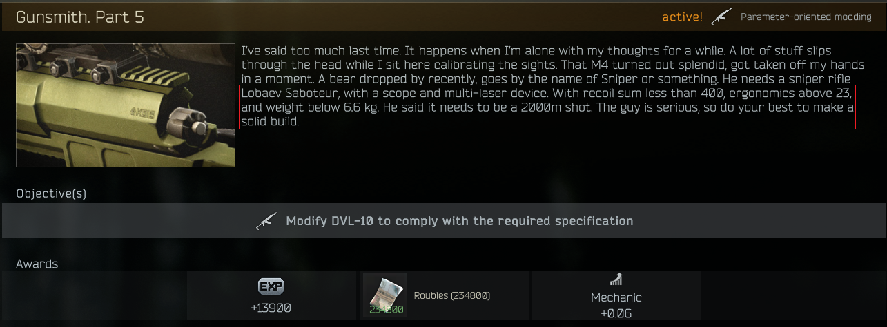 타르코프 0.12.9 버전 메카닉 건스미스 퀘스트 5 정보