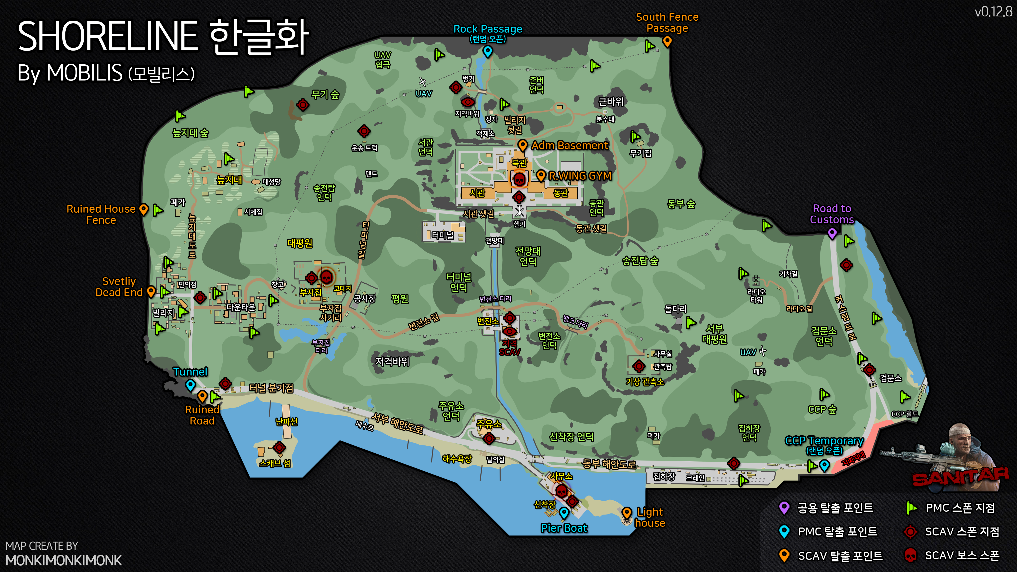 간단한 지명과 탈출구, SCAV 위치, 스폰 위치 등을 표시해 두었습니다.