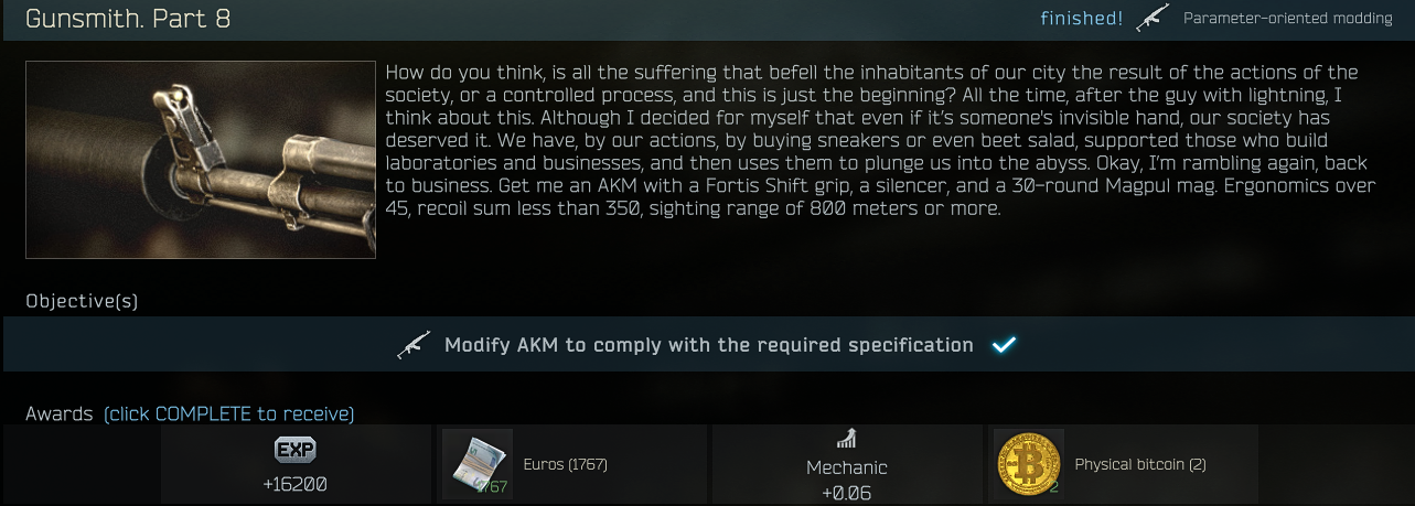 타르코프 0.12.9 버전 메카닉 건스미스 퀘스트 8 정보